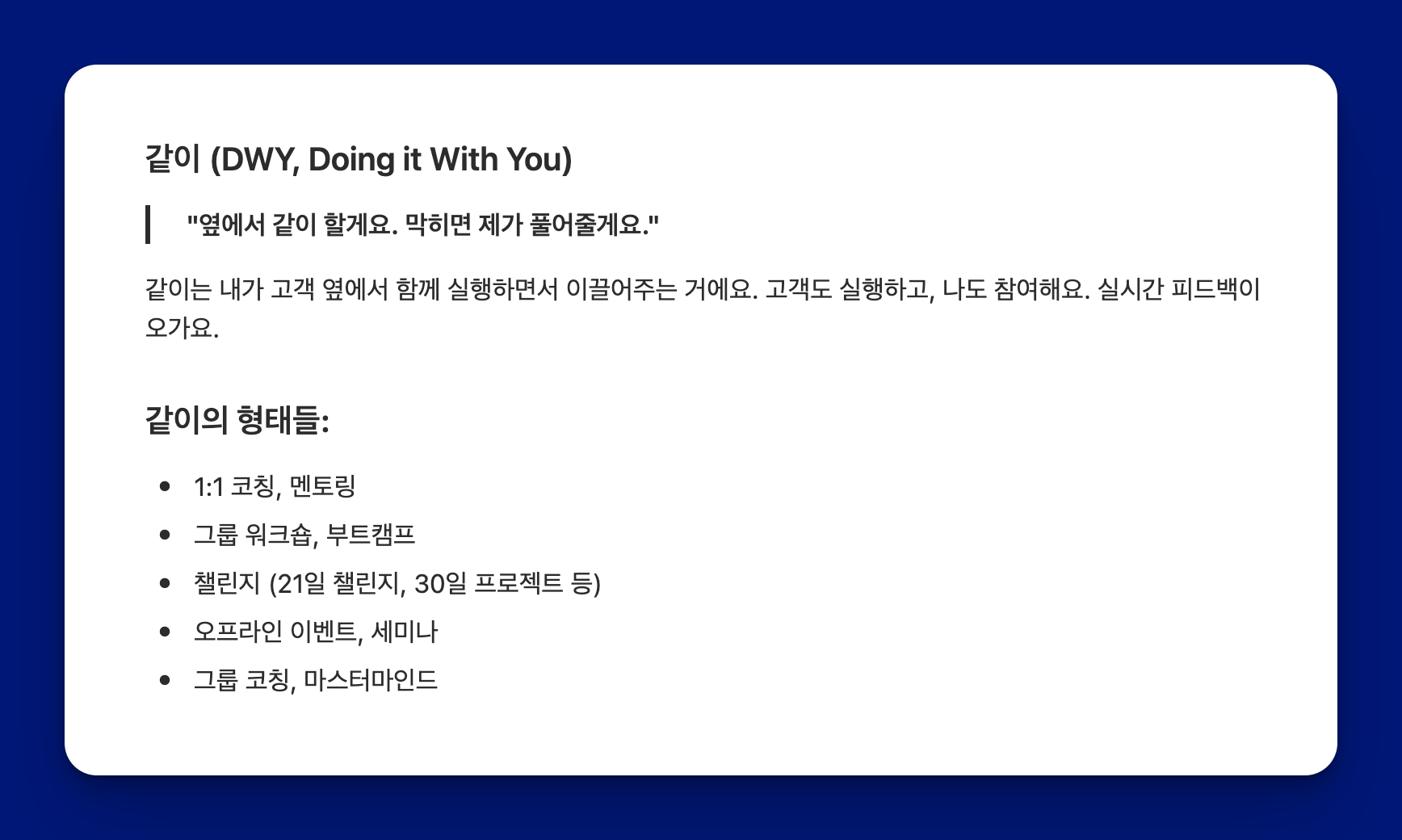 ๋ ๋ฒ์งธ ์ ํ์ "๊ฐ์ด"์์. ์ฝํธํธ ์ฝ์ค์์ ํจ๊ป ์์คํ ์ ์ธํ ํ๋ ๊ตฌ์กฐ์ ๋๋ค. DWY(Doing It With You)์ ๊ตฌ์กฐ์ ๋๋ค. ์ํธ์์ ๋ค๋ค๋ ๋ง๋ฆฌ ํ๋ญ์ 'Notion Mastery'๊ฐ ์ด๊ฑฐ์์.