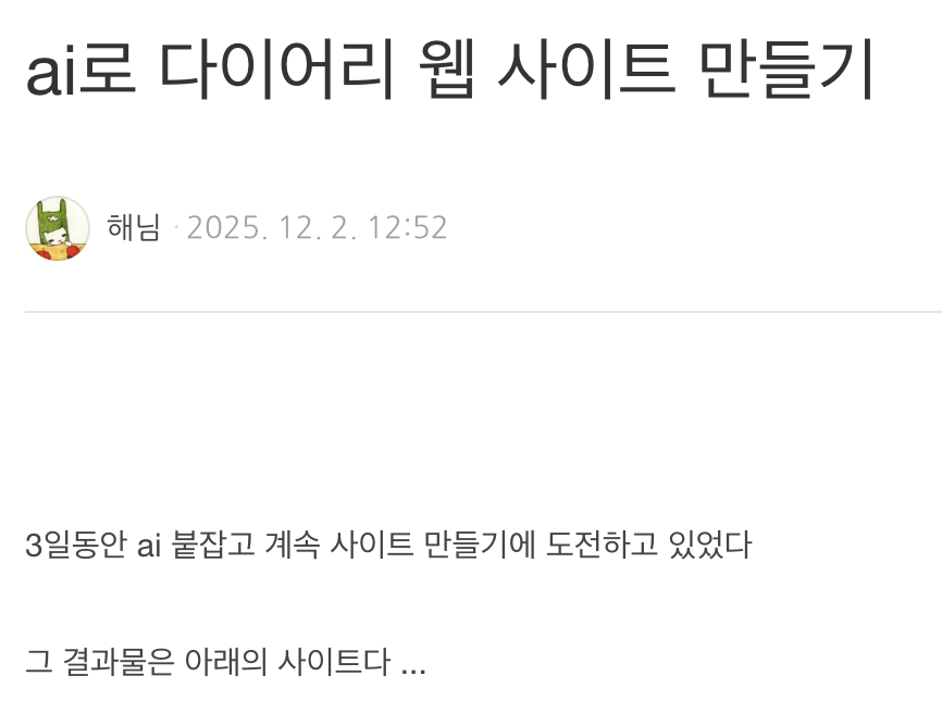 ๊ทธ๋ ๊ฒ ๋๊ณ ๋์ ๋ง๋ ๊ฒ์ด '๊ณ ์์ด ๋ฐฉ ๊พธ๋ฏธ๊ธฐ ๋ค์ด์ด๋ฆฌ ์น์ฌ์ดํธ'์์ต๋๋ค. ๊ธฐ๋ฅ? ๋จ์ํฉ๋๋ค. ์ผ๊ธฐ๋ฅผ ์ฐ๋ฉด ๊ทธ ๋ด์ฉ์ ๋ฐํ์ผ๋ก ๊ณ ์์ด ๋ฐฉ ์ด๋ฏธ์ง๋ฅผ ๋ง๋ค์ด์ค๋๋ค. ํ์ง๋ง ๊ฒฐ๊ณผ๋? ํธ์ํฐ์์ ๋ฐ์ด๋ด์ด ํฐ์ง๋ฉฐ ์กฐํ์ 20๋ง ํ๋ฅผ ๊ธฐ๋กํ์ต๋๋ค.