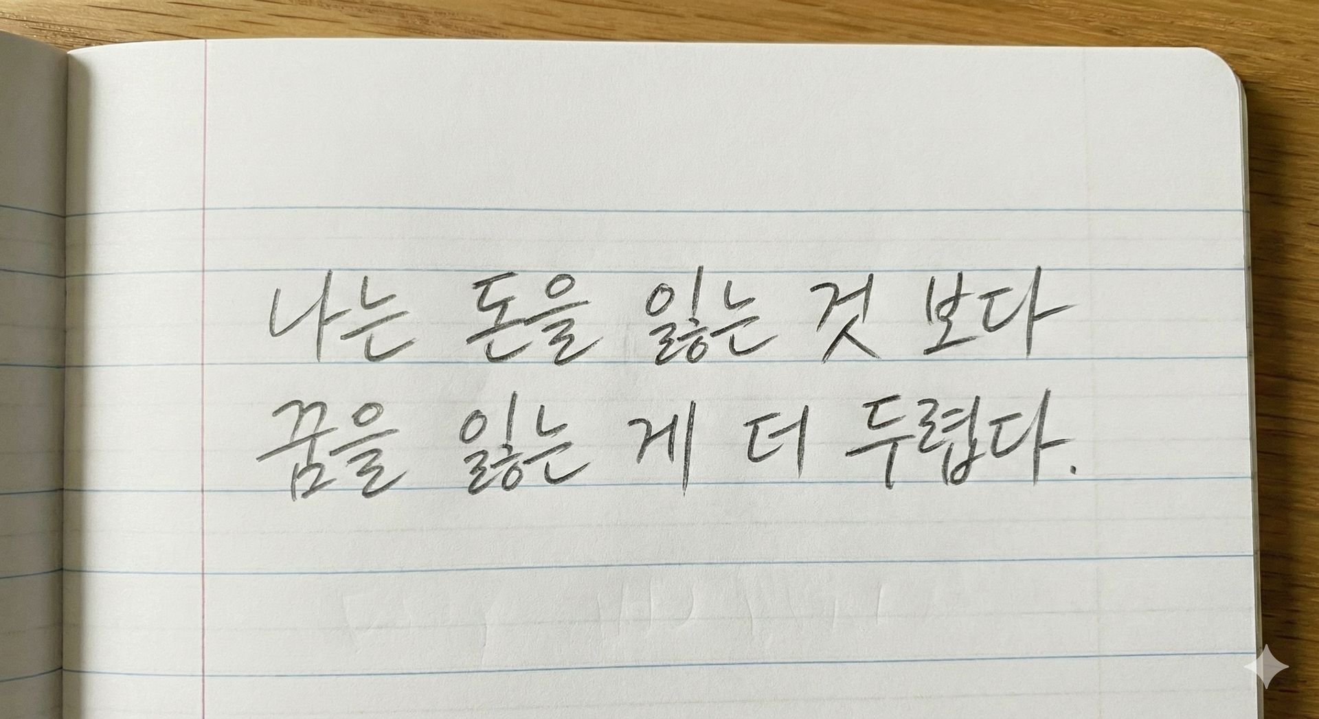 ๊ทธ๋๋ ๋ญ ํ์์ฐ ํ๊ฑฐ๋ ์๋ํ ๋ฐ๋ ๋ณ๋ก ์์ด์ ๋ ธํธ์ ๋์ ๋์ ๊ธฐ๋ก์ ๋ง์ด ํ์ต๋๋ค. ์ ๋ โ๊ฟโ์ ๋ํด ์ด๋ฐ ์๊ฐ์ ๊ฐ๊ณ ์ฌ์ ์ ํ์ต๋๋ค. ์ง๊ธ ๋ค์ ๋งํด๋ณด๋ผ๊ณ ํ๋ค๋ฉด.. ์ข ์ฒ ์ด ๋ค์๊ธฐ ๋๋ฌธ์ โ๋์ ์์ง ์๋, ๊ฟ์ ๊ฟ๋๋ค.โ